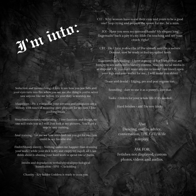- femdom, findom, tattoos, mistress, sph, worship, cbt, piercings, tattooed, owner, goth, sadist, keyholder, trainer, humillatrix, sissyfication, gothdom, advicer, mesmerising, analtrainer