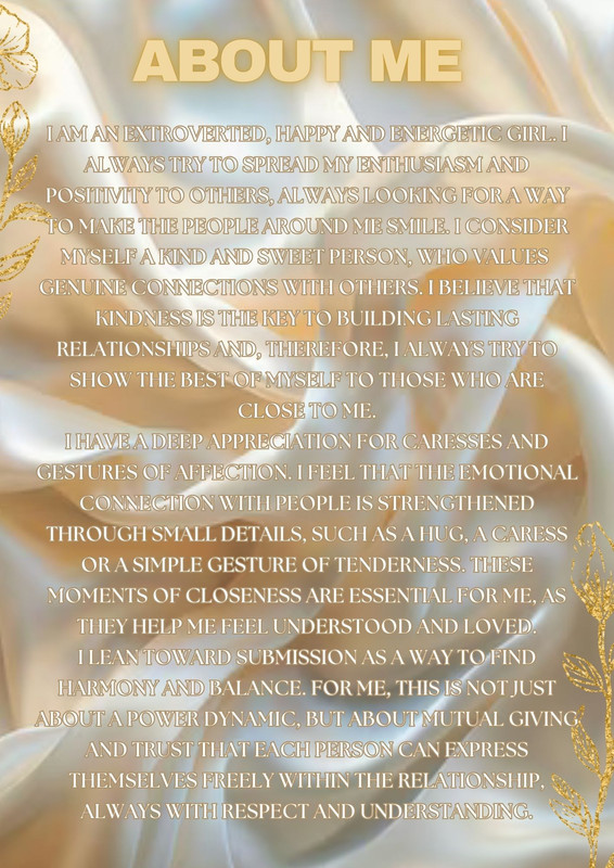 Я пышнотелая, соблазнительная, горячая и милая куколка здесь для вас. Я делаю то, что хочу, я люблю веселиться и мне приятно, когда за мной наблюдают, меня желают и когда мне говорят горячие вещи.